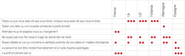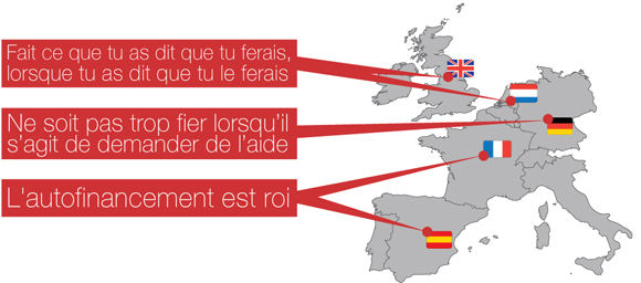 Les Britanniques, les Américains et les Hollandais s’accordent pour dire que le meilleur conseil qu’on leur ai donné est de toujours tenir leur parole « Fais ce que tu as dit que tu ferais, lorsque tu as dit que tu le ferais ». Les Allemands eux se retrouvent dans la maxime « Ne sois pas trop fier lorsqu’il s’agit de demander de l’aide » alors que les Espagnols, peut être plus pragmatiques, optent en majorité pour « l’autofinancement est Roi». Les entrepreneurs français sont-ils réceptifs aux mêmes arguments ou à d’autres ?