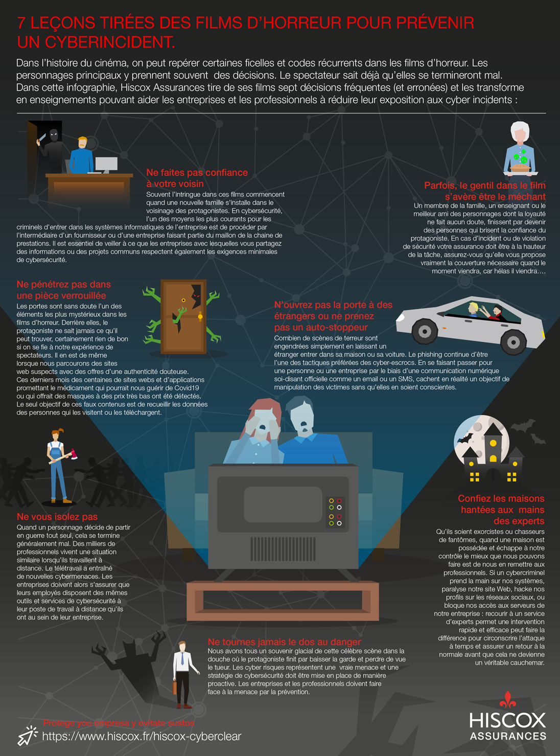 Dans cette infographie, nos experts en cyber assurance se sont amusés à faire le parallèle entre piratage informatique et film d’horreur. Résultat, ils ont listé 7 décisions fréquentes et erronées pour les transformer en enseignements afin d’aider les entreprises et les professionnels à réduire leur exposition aux cyber incidents: