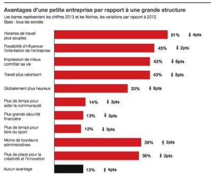 Un tiers des entrepreneurs s’estime plus heureux de travailler dans une petite entreprise plutôt que dans un grand groupe. Pour plus de la moitié des entrepreneurs, le fait d’avoir des horaires souples de travail est l’un des principaux avantages même s’ils sont plus longs. La possibilité d’influencer l’orientation de l’entreprise arrive en deuxième position, car cette liberté d’action représente un avantage important face à de grands groupes, où il est souvent plus difficile de faire entendre sa voix. Les entrepreneurs apprécient également le potentiel de créativité et d’innovation bien plus élevé dans une petite structure.
