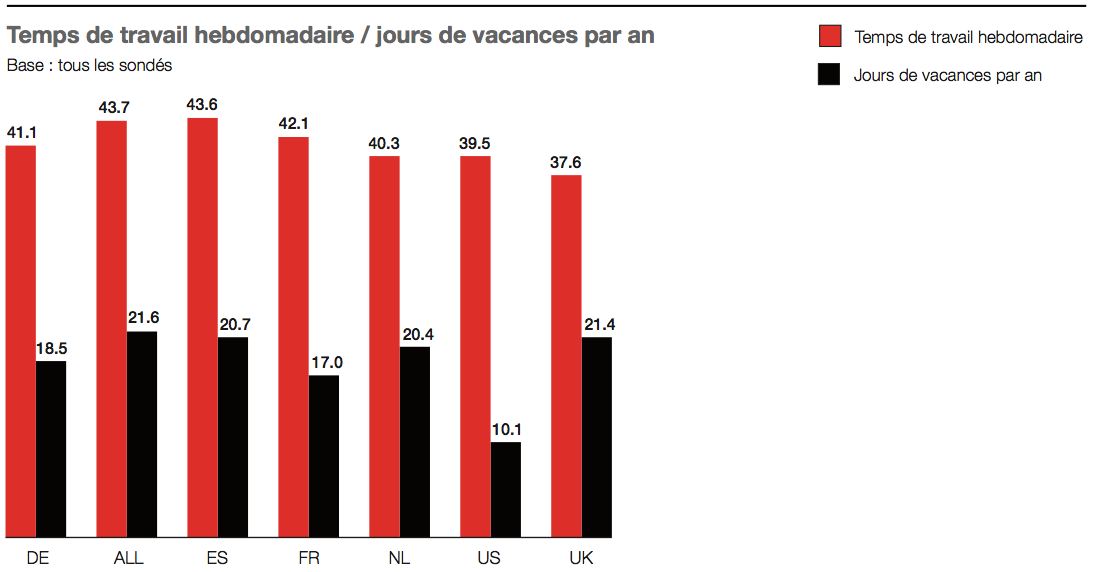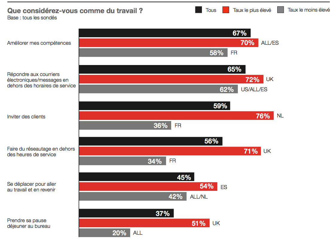 Les français ont une définition très pragmatique du travail puisqu’ils ne considèrent pas réellement comme du « travail » la formation, le réseautage ainsi que les pauses déjeuners. De leur côté, 71% des anglais estiment que le réseautage en dehors des horaires de service est du travail. Quant aux sondés allemands et espagnols, 70% d’entre eux pensent que l’amélioration de leurs compétences fait partie du travail quotidien des entrepreneurs. Enfin, dernier chiffre surprenant, 45% des sondés dans tous les pays considèrent que le trajet pour aller au bureau fait partie du travail.