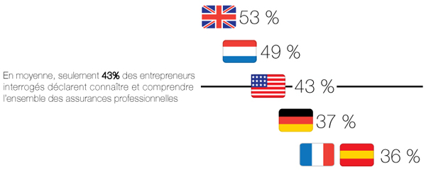 Au milieu de la montagne de formalités administratives qu’un entrepreneur doit affronter lorsqu’il monte son entreprise, se trouve l’épineux (et admettons-le, ennuyeux…) sujet des assurances à souscrire pour protéger son entreprise, dont son matériel, ses employés ... etc. En tant qu’assureur expert des assurances professionnelles nous avons voulu savoir si les entrepreneurs français étaient plus ou moins bien informés que leurs pairs étrangers. Globalement, l’assurance n’est pas un sujet simple pour les entrepreneurs. En effet seulement 43% de notre panel déclare connaitre l’ensemble des assurances professionnelles disponibles et comprendre les risques qu’elles permettent de couvrir. Pour autant, on note de vrais écarts entre les différents pays : les Britanniques sont les plus confiants de tous, plus de la moitié d’entre eux (53%) pensent être suffisamment informés, suivent ensuite les Hollandais (49%), les Américains (43%) puis les Allemands (37%) et enfin nos voisins Espagnols (36%).