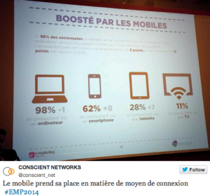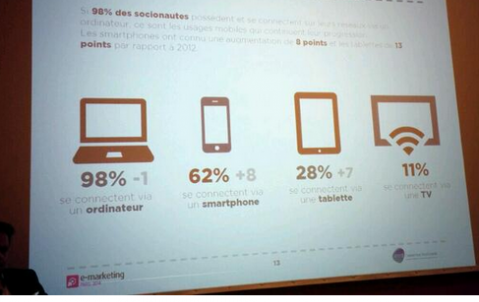 Les moyens de connexion se multiplient : alors que 98% des utilisateurs se connectent via leurs ordinateurs, 68% utilisent également leurs smartphones pour surfer, 28% leurs tablettes et 11% leurs TVs connectées. Le multicanal est omniprésent, et tend à faire évoluer les usages et le contenu (Whatsapp en faveur du sms). Le smartphone a fortement développé la notion de mobilité : les mobinautes se servent maintenant de la géolocalisation et de services comme Foursquare pour informer leurs amis de leurs déplacements. 74% des mobinautes se connectent au moins une fois par jour à un réseau social. Avec une prévision de 80 milliards de produits à horizon 2020, les objets connectés sont une nouvelle tendance. Google glass, brosse à dents connectée, stylo… L’internet des objets se multiplie outre-Atlantique et bien que 55% des français se disent prêts, 78% d’entres eux envisagent les objets connectés comme un risque pour leurs données privées. Cependant l’exploitation des données personnelles est en général acceptée si celles-ci sont utilisées en faveur du client et du service proposé. Par exemple, le géomarketing est accepté par 59% des utilisateurs de smartphones.