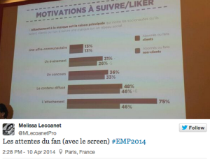 D’après une étude TGI Clickstream, 5,7 millions de Français seraient accros aux réseaux sociaux et y passeraient plus de 23 heures par mois. Cette communauté en ligne est une vraie mine d’or pour les entreprises. En effet, 50% des utilisateurs suivent plus de 5 marques sur Facebook ou Twitter. Alors que 83% de ces fans sont clients de la marque suivie, les raisons pour lesquelles les socionautes suivent ces marques sont variées :