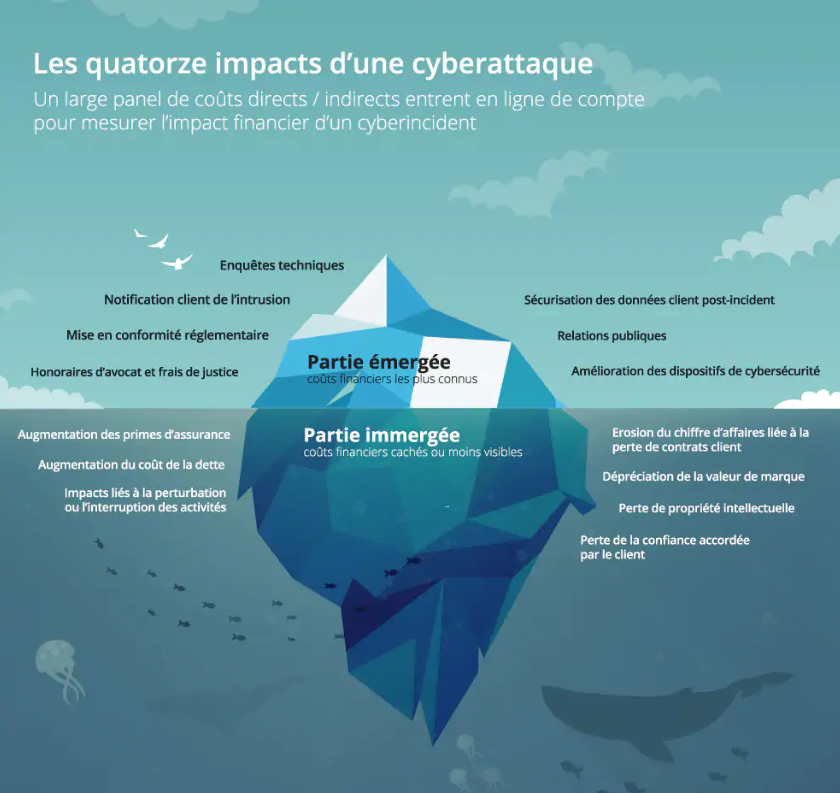 Il arrive souvent, lorsqu’un dirigeant d’entreprise cherche à évaluer ce que pourrait lui coûter une cyberattaque qu’il sous-estime les risques et les pertes potentielles. En effet, on se contente bien souvent d’une estimation de « surface » qui ne prend en compte que les coûts directement liés à l’attaque : information des clients, surveillance du crédit, frais juridiques ou sanctions réglementaires. Si cela semble déjà beaucoup ils ne sont que la partie immergée de l’iceberg