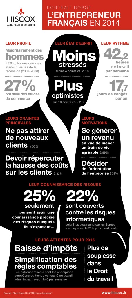 Au-delà de sa présence sur le stand 103, Hiscox animera également un atelier de réflexion sur la thématique suivante : Quels sont les enjeux de la Responsabilité Civile Professionnelle pour votre entreprise ? Cet atelier gratuit est ouvert aux inscriptions. Ce salon des entrepreneurs est également pour Hiscox l’occasion de revenir sur la grande étude eDNA menée auprès de 3 500 dirigeants en Europe et aux Etats-Unis. Suite à l’analyse des résultats, Hiscox a pu dresser un profil de l’entrepreneur français en 2014 que nous souhaitons partager avec vous.