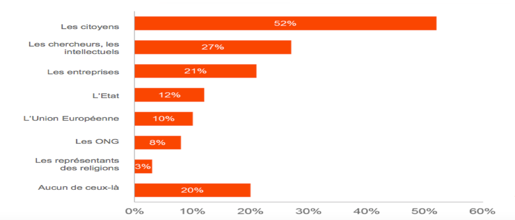 Sur qui comptent les Français pour retrouver la confiance perdue ? Les entreprises arrivent en troisième position (21%) sur la liste des acteurs privilégiés pour résoudre ces problèmes. Presque deux fois plus que l’Etat !