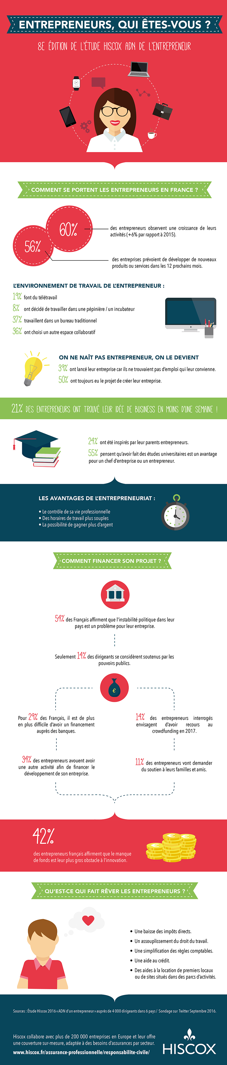 Pour la 8e année consécutive Hiscox vient de lancer son étude "ADN d'un entrepreneur". A cette occasion nous avons interrogé 4 000 entrepreneurs en Europe, au Royaume-Uni et aux Etats-Unis à propos de leur activité et de leurs perspectives d’avenir. Pour la première fois, l’ensemble des six pays étudiés connaît une croissance d’activité au sein de leurs entreprises. En France, 60% des dirigeants interrogés affirment avoir enregistré une croissance de leur activité en 2016 !
