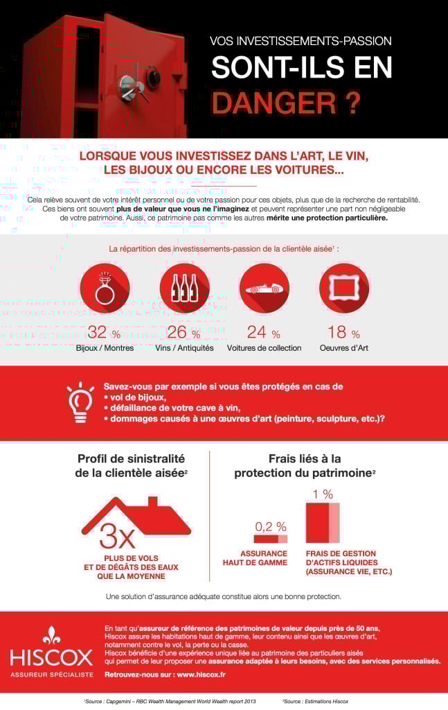 Selon l’observatoire national de la délinquance et de la réponse pénale*, les cambriolages ont augmenté en 2013 de 6,4% en zone urbaine et de 4,7% en zone rurale. 2013 a été l'année où le plus de cas ont été signalés en 3 ans, et il est fort probable que 2014 suive cette tendance. Aujourd'hui, les systèmes de protection optimaux n'existent malheureusement pas. Comme le montre l'infographie ci-dessous, les patrimoines privés haut de gamme sont exposés à 3 fois plus de vols que la moyenne. Il est par conséquent primordial de connaître précisément la valeur des biens qui les composent et de considérer la possibilité de souscrire une assurance spécialisée pour les préserver au maximum.