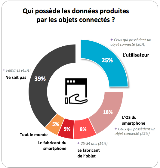 Le fait que les objets connectés produisent de la data est bien clair dans la plupart des esprits. N’ignorant pas ce principe, les Français semblent pourtant porter un regard inquiet sur les risques qui y sont associés : la moitié d’entre eux se dit effrayée par le risque de fuite des données personnelles, et plus des deux tiers considèrent que les données sont mal protégées ! Ce sentiment est largement partagé dans la population, y compris auprès des « early adopters », déjà équipés d’un ou plusieurs objets connectés. Une interrogation subsiste : que deviennent les données connectées et surtout à qui appartiennent-elles ? À ce sujet les répondants demeurent très partagés, comme le montre ce graph.