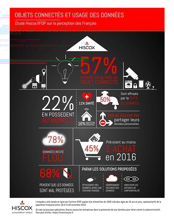 Pour retrouver les résultats complets de l’étude, cliquez ici : Ifop - Rapport de synthèse - Hiscox Objets connectés. L’utilisation des objets connectés entraînent de nouveaux risques pour vous et votre entreprise. En tant qu’assureur spécialiste, nous vous proposons une assurance datarisk pour lutter contre les risques de cybercriminalité et de fuites de données.