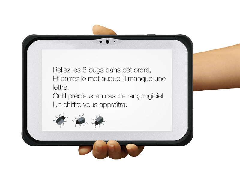 Reliez les deux bugs du haut d’un trait droit. Puis reliez le bug qui se trouve en haut à droite avec celui qui se trouve en bas à gauche. Enfin, rayez le mot écrit en rouge “CHIFFREMEN” (Point 12). Ces trois traits dessinent un 7 .