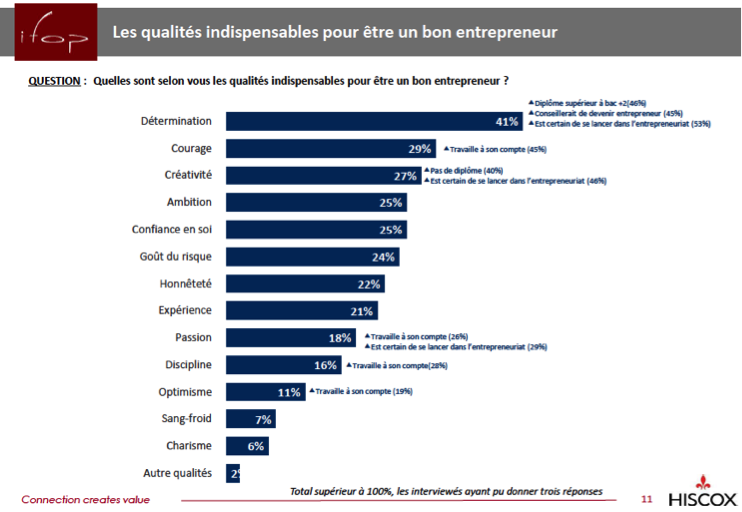 Avant de découvrir l’intégralité des résultats de notre étude Hiscox/IFOP dans quelques jours, nous vous proposons de nous arrêter sur une des questions en particulier : d’après les personnes interrogées, quelles sont les qualités essentielles pour être un bon entrepreneur ? Détermination, courage et créativité La détermination est la qualité la plus importante à avoir pour 41% des français, suivie par le courage (29%) et la créativité (27%). Mais pour se lancer, il faut également croire en ses capacités, c’est pourquoi l’ambition et la confiance en soi arrivent dans le top 5 des atouts pour entreprendre.