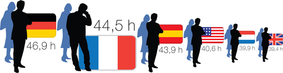 Et bien les français sont les plus assidus à la tâche juste derrière les Allemands. Ils déclarent ainsi travailler 44,5h par semaine. Ils sont ensuite suivis par les espagnols (43.9h), puis les américains (40,6h) et enfin les hollandais (39,9h).