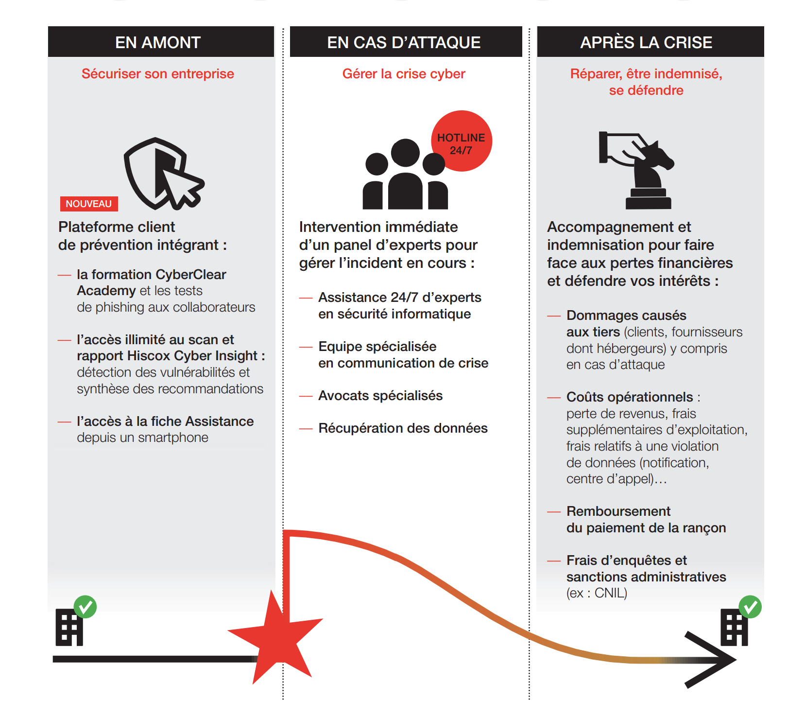 CyberClear by Hiscox prévoit un accompagnement complet dès la souscription avec des services de prévention des risques cyber, l’assistance pendant la gestion de l'incident et après la crise pour vous aider dans la reprise de l’activité et la gestion des recours possibles suite à cette attaque.